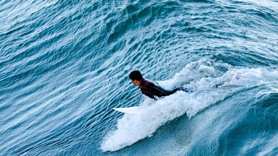 Una buena remada significa más olas. Mantén tu cuerpo centrado en la tabla, el pecho ligeramente levantado y realiza brazadas largas y profundas. Evita salpicar o mover los brazos con prisa. Practica ejercicios de remada en agua plana para ganar resistencia y técnica.